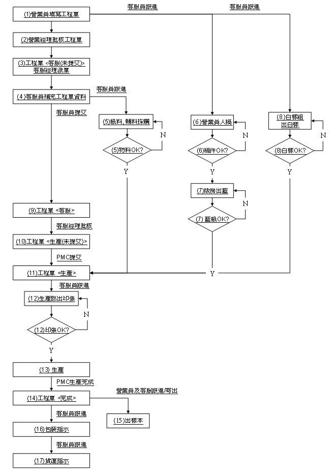 營業員提供書樣資料給客服員, 客服員將資料交予白樣組員工製作白樣。客戶確認白樣後, 白樣可給生產部作參考。 |