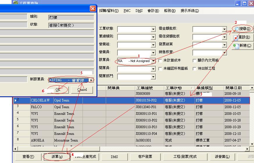 營業經理批核後, 工單狀態轉為 “未提交”, 客服經理將工程單分派給不同客戶服務員; 在 Sales/CS à 工程單查詢, “跟單員” 選項中選擇 “N/A – Not Assigned”, 點擊 “搜尋”, 系統列出未有分派客戶服務員的工程單, 客服經理點擊需要的紀錄, 再點擊 “派單”, 出現 “工單委派” 視窗; 在 “新跟單員” 選項中選擇需要的跟單員, 完成後點擊 “OK”。