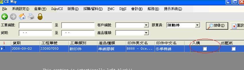 營業員填寫工程單時, 會同時入稿, 客服員需要跟進所入的稿件。客服員收到客戶的入稿後, 到 Sales/CS à CS Wip 打勾該項工單的 “入稿” (CS Wip 詳細使用方法請參閱 “CS Wip使用功能說明”) (Sales 亦需同時在 Sales Wip打勾該項工單的 “入稿”)