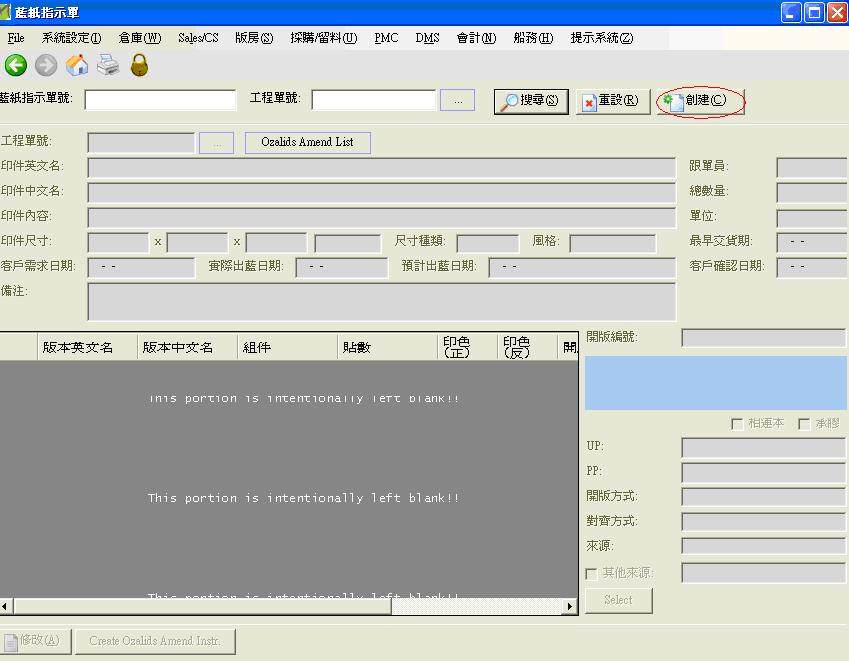 印前同事確認來稿妥當後, 客服員到 Sales/CS à 工程單, 點擊該工程單的 “藍紙鎖定” 按鈕, 點擊 “出藍確認” 再點擊 “創建藍紙單” 新增藍紙指示單及填寫資料 (或在 Sales/CS à 藍紙指示單, 點擊 “創建” 新增藍紙指示單, 輸入工程單號及填寫資料) (藍紙指示單詳細使用方法請參閱 “藍紙指示單使用功能說明”)